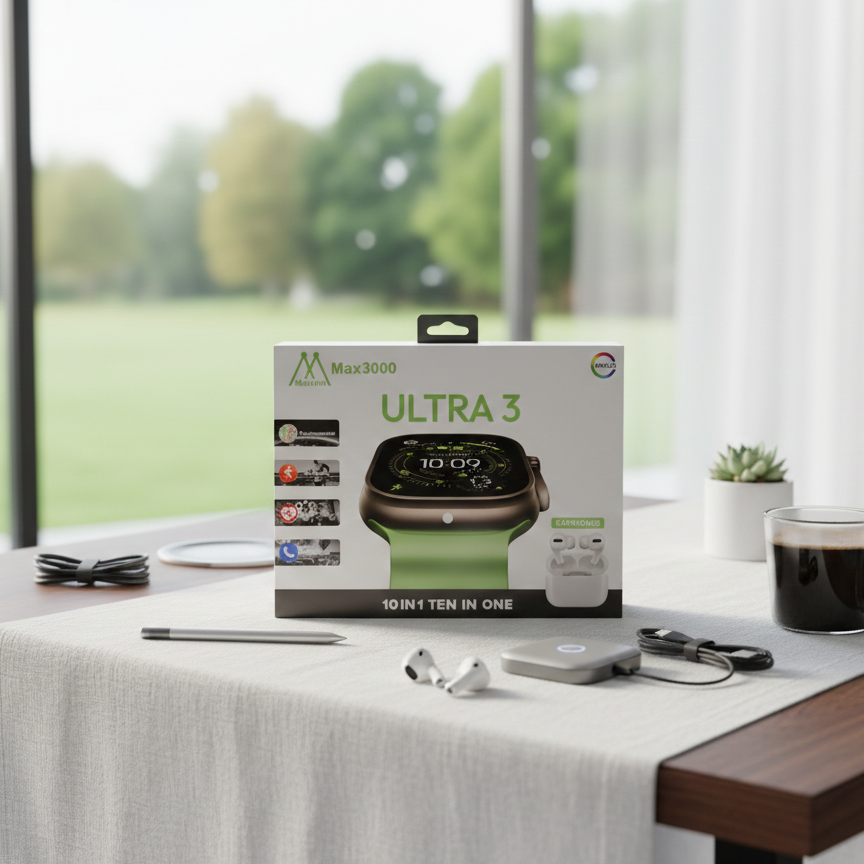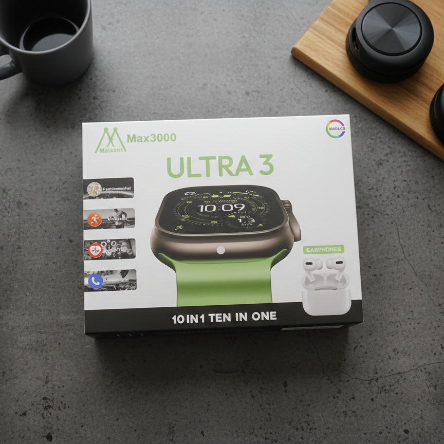 The Maixinn Max3000 Ultra 3 Smart Watch Comes With A Clear AMOLED Display And A Modern Design. It supports multiple functions shown as 10 in 1 (ten in one). The watch includes options such as position market movement, heart rate, and phone chat. The product is presented with earphones as shown on the box and is designed for daily smart usage.